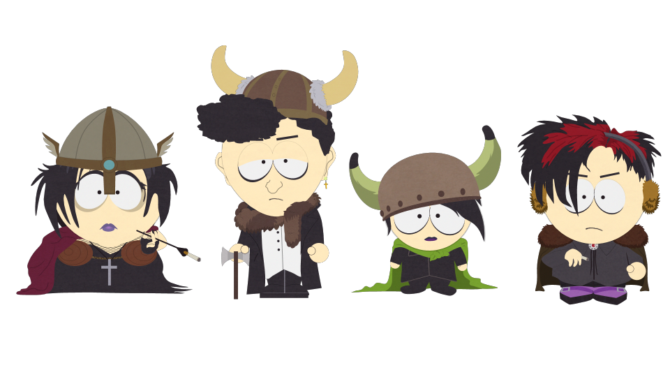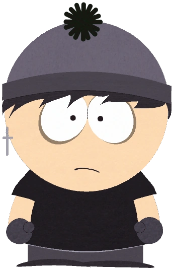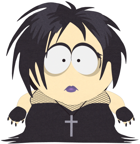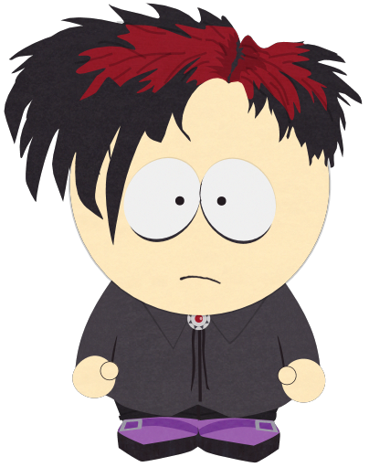 The Goth Kids are the group of goth children at South Park Elementary. They are usually seen hanging around the café Benny's and the Village Inn. They also hang out behind the school, near the loading bay and parking lot. They all wear black clothes and eyeliner and have black hair and pale skin as well as being heavy smokers.